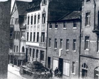 Von der Reichsstr. 88 (heute B88) bog der Aufklärungstrupp ins Stadtzentrum ab, fuhr an der Sparkasse vorbei und wurde hier von den vom Stadtzentrum aus vorrückenden Amerikanern unter Feuer genommen. Der Kübelwagen wurde zerstört, der deutsche Panzer konnte noch einige Schüsse abgeben blieb dann aber liegen. Trotz der zahlreichen US-Soldaten schafften es die deutschen Soldaten sich zu verstecken, um am nächsten Morgen entlang der Saale bis zu der noch intakten Eutersdorfer Schauckelbrücke zu gelangen, diese zu überqueren und sich Richtung Hummelshain abzusetzen.
