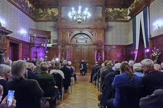 Neben dem Vergnügen diente das Event einem guten Zweck. Es war Auftakt der Spendenaktion 2024 des Fördervereins, die unter dem Motto „Bilder-Retter gesucht!“ steht. Worum es dabei geht, hatten die Gäste während des Konzerts unmittelbar vor Augen - zwei in der Vergangenheit durch eindringendes Regenwasser zerstörte Bilder des farbenkräftigen Gemäldefrieses im Festsaal. Diese sollen bis Jahresende restauriert werden, wofür der Verein rund 15.000 € Spenden einwerben will.