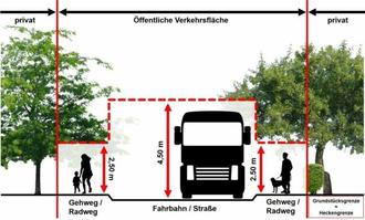 Bäume, die in den öffentlichen Verkehrsraum hineinragen, sollen über dem Gehweg bis in einer Höhe von ca. 2,50 Metern und über der Fahrbahn bis in einer Höhe von ca. 4,50 Metern freigeschnitten sein.