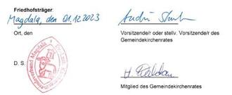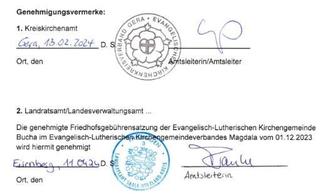 Die Rechtsaufsichtsbehörde, die für die Kommunalgemeinde zuständig ist, auf deren Gebiet sich der Friedhof befindet, hat am 11.04.2024 die erforderliche Genehmigung erteilt.