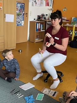 Die zahnmedizinische Fachangestellte Joana Weinberger, Mama von Noah, erklärte das Spektrum an Tätigkeiten in ihrem Beruf: Sie organisiert den internen und externen Ablauf in einer Praxis, assistiert bei Untersuchungen und Behandlungen und führt auch selbst z.B. Vorsorgetermine durch.