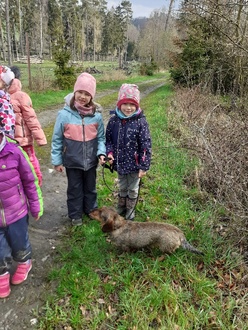 Mit neuen Waldspielen, Rätseln und Interessanten von den heimischen Waldtieren und unserer Natur begeisterte André Kaul die Kinder und intensivierte ihre Neugier an naturwissenschaftlichen Themen rund um unseren Wald. Begleitet wurden die Wanderung von dem Dackel Dana.