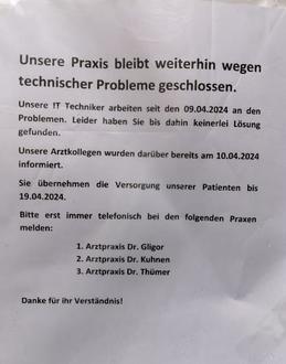 Probleme gab es nach dem Urlaub in der Praxis Dr. Koroknai. Als man frisch erholt wieder mit der Patientenbetreuung anfangen wollte, streikte die Technik. Genauer gesagt, der Server für die Computer der Praxis war defekt und so war man nicht mehr in der Lage auf Patientenakten zugreifen zu können sowie Rezepte auszustellen. Gerade jetzt, wo das viel gepriesene E-Rezept seinen Anlauf hat. Deshalb musste das Team, um Dr. Koroknai, die Praxis schließen und die Computeranlage wieder zum Laufen bringen. Mit einer Nachricht an der Eingangstür der Praxis wurde darüber informiert. Der Defekt des Computersystems war erheblich, sodass die Praxis einige Tage nicht arbeiten konnte. Statt Patienten waren IT-Techniker im Haus und haben dafür gesorgt, dass die Praxis ihre Arbeit wiederaufnehmen konnte. Die Praxis Koroknai hatte mich über dieses Problem informiert und ich habe, soweit es mir möglich war, über die sozialen Medien, die Bevölkerung informiert.