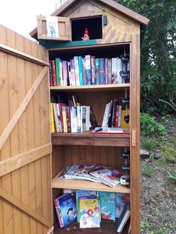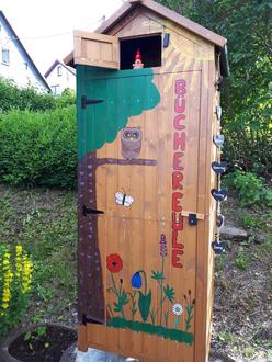 Rene Mütze erklärte sich bereit, den Aufbau zu übernehmen. Er fand auch hilfreiche Hände von fünf Familien. Anfang Juni war der Aufbau fertig. Christina Möller entwickelte eine Idee zur äußeren Gestaltung und bemalte damit den Schrank. Er hatte von den Frauen den Namen „Büchereule“ erhalten.