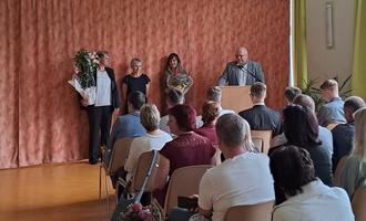 Zum einen war da die Zeugnisausgabe der Schulabgänger in der Regelschule Lichte. Es ist eine wunderbare Sache, dass hier auf der Höhe eine Grundschule Schmiedefeld im Landkreis Saalfeld - Rudolstadt und eine Regelschule in Lichte, im Landkreis Sonneberg, auf dem kurzen Dienstweg kooperieren, unterstützt durch die kommunale Politik und natürlich durch den hiesigen Schulförderverein, der nicht alle aber viele Vorhaben finanziell unterstützt. Monique Liebmann, Vorsitzende des Schulfördervereines, Carolin Faust, Vertreterin des Neuhäuser Ortsteiles Lichte sowie ich als Vertreter des Saalfelder Ortsteiles Schmiedefeld gratulierten den Schülerinnen und Schülern zu ihren Abschlüssen und bedankten uns bei der scheidenden Schulleiterin der Regelschule Lichte, Frau Bergmann, die am Ende des Schuljahres in den verdienten Ruhestand geht, für ihre über vierzigjährige Tätigkeit an der Regelschule Lichte. Sie hat als Lehrerin, stellvertretende Schulleiterin und zuletzt als Schulleiterin dafür gesorgt, dass die Regelschule Lichte sich einen Namen in der Region gemacht hat und sie in dieser langen Zeit unzählige Schülerinnen und Schülern half, sich auf das spätere Leben vorzubereiten.