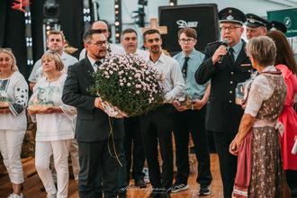 Am Sonntag begann das Erntedankfest mit einem Gottesdienst in der Holzkirche von Bierdzany. Dies ist immer wieder trotz immer noch mangelndem Sprachverständnis ein besonderes Erlebnis. Im Anschluss an diesen Gottesdienst, in dem auch die Erntekrone von Bierdzany gesegnet wurde, hatten sich vor der Kirche Transporter und Traktoren mit den Erntekronen der anderen Ortsteile eingefunden. Im Verband mit Themenwagen verschiedener Vereine und Gruppen aus den einzelnen Ortsteilen erfolgte dann der Umzug durch Bierdzany zum Festzelt, wo die Kronen von den Wagen auf dem Tanzboden ausgestellt wurden.