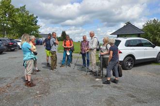 Für mich persönlich fühlt sich Badewetter etwas anders an. Und das, wo doch Dr. Uli Knopf in seiner Einladung ein erfrischendes Bad im Silbersee in Aussicht gestellt hat. Dort wollen wir nämlich auf unserer Wanderung am Sonntag, dem 13. August 2023, vorbeikommen. Bis dahin muss allerdings erst noch etwas Zeit vergehen, als sich ungeachtet der ziemlich trüben Witterung ein ansehnliches Trüppchen wander- und womöglich auch badelustiger Leute auf dem Dorfplatz in Wickersdorf einfindet. Angeschlossen eine Reihe Autos, denn die ersten Kilometer bis nach Hoheneiche wollen wir fahrend zurücklegen, was auch ganz ausgezeichnet gelingt.