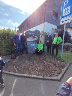 Unmittelbar an der Bundesstraße B 281 in Höhe Zufahrt Ärzteparkplatz / Wanderparkplatz ist die ideenreich gestaltete und markante Gedenktafel gut sichtbar, für die Vorbeifahrenden auf einem großen Felsbrocken aus Kamsdorf angebracht.