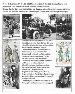 Im Jahr 1074 wurde unser Heimatort Unterwirbach historisch erstmals urkundlich erwähnt. Anlässlich dieses Ereignisses, das sich 2024 zum 950. Mal jährt, organisieren wir eine Reihe von Festtagen in der Zeit vom 27. Juli bis 04. August 2024, die dieses Jubiläum würdigen.