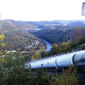 Nun ging es endlich los bis zur Rohrbrücke des Pumpspeicherwerkes. Das Wetter hatte es wieder besonders gut mit uns gemeint, sodass sich dort ein herrlicher Blick über den gesamten Stausee Hohenwarte, über das Pumpspeicherkraftwerk und weiter bis zum Unterbecken Eichicht bot; vor uns die mächtige Rohrbahn und über uns das Einlaufgebäude des Oberbeckens. Hier gab es wieder umfangreiche Informationen zur Nutzung der Wasserkraft durch den Vattenfall Konzern in diesem Gebiet.