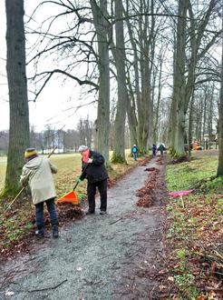 Weiterhin konnten die Wege, Wegesränder und Wiesen vom Spielplatz beginnend bis zur Skulptur „Die Familie“ gesäubert werden. Hier wurden überwiegend abgebrochene Äste abgelesen und zum Kompost gebracht. Danach konnte auch noch der Weg zur Naturbühne vom Laub befreit werden - hier wurden dicke Laubschichten in die angrenzenden Waldflächen gefegt.