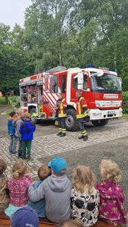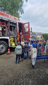 Doch was war das? Konnte man nicht aus der Ferne ein "Tatü-Tata" hören, welches immer lauter wurde? Der Sache mussten wir auf den Grund gehen und tatsächlich stand auf einmal ein Feuerwehrauto vor unserem Kindergarten. Feuerwehrfrau Klara erklärte uns ein paar wichtige Dinge und gewährte uns einen Einblick ins Innere des großen roten Autos. Bei Feuerwehrmann Alex konnten die kleinen Feuerwehrleute unter Beweis stellen, ob sie ordentlich Zielwasser getrunken hatten, denn mit einem Wasserstrahl mussten sechs Dosen von einem Tisch geschossen werden.