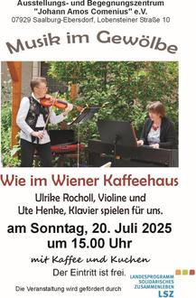 Ulrike Rocholl (Violine) und Ute Henke (Klavier) spielen Musik „Wie im Wiener Kaffeehaus“ bei der Veranstaltungsreihe „Musik im Gewölbe“ am 20.Juli ab 15 Uhr. Dieses Konzert wird durch das Landesprogramm Solidarisches Zusammenleben gefördert. Natürlich wie immer mit Kaffee und Kuchen.