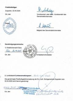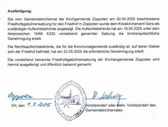 Der Gemeindekirchenrat der Ev.-Luth. Kirchgemeinde Zoppoten hat aufgrund von § 44 Absatz 1 des Kirchengesetzes Kirchengesetz über die evangelischen Friedhöfe in der Evangelischen Kirche in Mitteldeutschland (Friedhofsgesetz - FriedhG) vom 20. November 2020 (ABl. EKM 2020 S. 228), in seiner Sitzung am 02.04.2025 die folgende Satzung beschlossen: