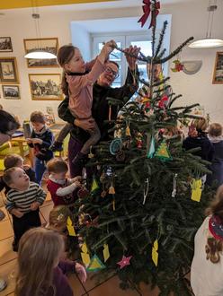Die Kinder bringen jedes Jahr kleine selbstgebastelte Anhänger mit und schmücken mit diesen und auch mit dem Baumschmuck aus dem letzten Jahr gemeinsam den Weihnachtsbaum.