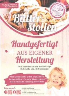 Mit dieser wunderbaren Idee kam das Wurzbacher Backhaus auf das Tourismus Team Saalburg-Ebersdorf zu. Die frisch gebackenen Stollen sind nicht nur ein Genuss für die ganze Familie, sondern auch eine Möglichkeit, die wertvolle Arbeit der Saalburg-Ebersdorfer Kindergärten zu unterstützen. Denn für jeden verkauften Butterstollen wird 1 EUR an die Kindergärten gespendet, um Projekte und Aktivitäten für die Kinder zu finanzieren, die deren Entwicklung und Kreativität fördern. Die handgefertigten Stollen werden aus hochwertigen Rohstoffen und nach traditionellem Rezept zubereitet.