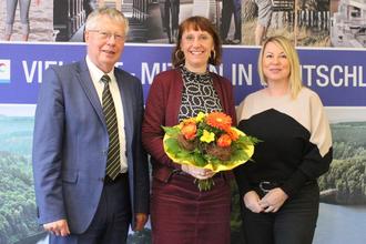 Der Vorstandsvorsitzende Thomas Fügmann und Mitarbeiterin Antje Heeger heißen Katrin Pflieger als neue Geschäftsführerin im Tourismusverbund Rennsteig-Saaleland willkommen.