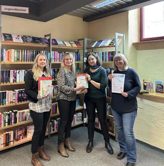 Anja Behrenhof und Beate Herrgott übergeben Bücherpaket an Martina Rübesam von der Bibliothek Pößneck und an Annegret Smieskol vom Jugendhaus Pößneck