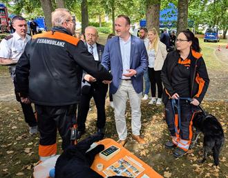 Den ersten Bad Lobensteiner Blaulicht-Familiennachmittag hatte die Freiwillige Feuerwehr der Stadt unter Federführung von Tobias Freund organisiert. Die Kameradinnen und Kameraden boten Führungen durch das Gerätehaus an und im angrenzenden Stadtpark stellten sich zahlreiche weitere Vertreter der Blaulichtfamilie vor. Dazu gehörten u.a. die Polizei Thüringen, die Ortsverbände des Technischen Hilfswerks aus Naila und Gera, das Team der Psychosozialen Notfallversorgung des Saale-Orla-Kreises sowie des DRK, die Freiwillige Feuerwehr Hirschberg mit ihrem neuen Tanklöschfahrzeug, der „Wünschewagen“ des Arbeiter-Samariter-Bundes aus Jena sowie die Tierrettung Hof, die über das deutschlandweit einzige intensivmedizinisch ausgestattete Fahrzeug für die Rettung von Tieren verfügt.