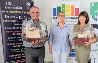 Bei der Festveranstaltung wurden Frank Roßner (links), Gabriele-Henze-Rippin (rechts) und Manuela Kaufmann (nicht im Bild) als langjährige, verlässliche Partner in der Jugendarbeit von Jugendamtsleiterin Ines Krasser (Mitte) für ihr großes Engagement geehrt.