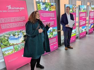 Claudia Schönfeld von der Stiftung Thüringer Schlösser und Gärten erläutert bei der Ausstellungseröffnung im Landratsamt die historischen Besonderheiten der Thüringer Residenzenlandschaft.