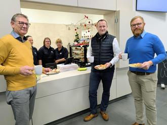 Landrat Christian Herrgott (Mitte) zusammen mit dem Geschäftsführer der Schleizer Werkstätten gGmbH Friedrich Semmler (rechts) und Werkstattleiter Hanjo Butz (links) beim ersten öffentlichen Frühstück in der Mensa der Regelschule Schleiz.