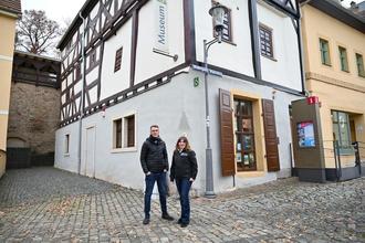 Franziska Spitzweg und Robert Radicke vor dem Pößnecker Museum 642.