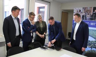 Bad Lobensteins Bürgermeister Dominik Kirsten (2. von rechts) – bis zu seiner Wahl als Notfallsanitäter tätig – erklärt Stefan Götz (von links) und Dirk Heinrich von der Sparkasse, Hirschbergs 1. Beigeordneter Patricia Duch sowie Landrat Christian Herrgott die Funktionsweise des Defibrillators.