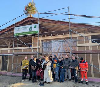 Bei einer kleinen Andacht anlässlich des Richtfestes spendeten Pfarrerin Anne Boelter und Pastorin Stephanie Ladwig gemeinsam den kirchlichen Segen für den Bau, den sie als Ort der Barmherzigkeit und Nächstenliebe bezeichneten.