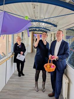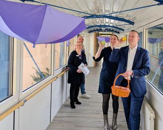 Die Thüringer Ministerin für Soziales, Gesundheit, Arbeit und Familie, Katharina Schenk, und Landrat Christian Herrgott gehören zu den ersten Gästen, die den Parcours durch die Einrichtungen der Diakoniestiftung in Ebersdorf absolvieren.