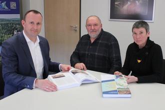 Thomas Queck – leitender Mitarbeiter im Gebietsreferat Ost des Thüringer Landesamtes für Denkmalpflege und Archäologie Weimar übergab kürzlich im Beisein von Sabine Berner von der Unteren Denkmalschutzbehörde ein Exemplar dieser Sonderveröffentlichung an Landrat Christian Herrgott.