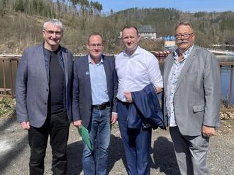Die beiden Landräte Marko Wolfram (links) und Christian Herrgott (3. von links) gemeinsam mit Thüringen Umweltminister Tilo Kummer und Ex-Bundestagsmitglied Reginald Hanke, dem „Beschaffer“ der 7,1 Millionen Euro Bundesförderung, am Brückenwiderlager Altenroth.