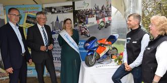 Am Stand der Stadt Schleiz wurde zur Saale-Orla-Schau das Jubiläum 100 Jahre Schleizer Dreieck beworben. Beim Messerundgang sprachen (v.l.n.r.) Mario Sachs, Projektleiter des Saale-Orla-Schau bei der RAM Regio Ausstellung GmbH und Landrat Thomas Fügmann mit der Wisentsaperle Vivianne Mittig sowie Mirko Ellrich und Almut Lukas von der Stadtverwaltung Schleiz.