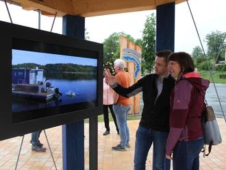 Daniel Röll vom Zweckverband Tourismus und Infrastruktur Thüringer Meer und Katrin Pflieger vom Tourismusverbund Rennsteig-Saaleland am multimedialen Infopunkt des Ankerorts Gräfenwarth-Sperrmauer.