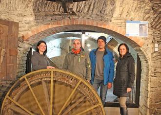 Das Wasserrad im Rücken und froh über das Erreichte: Museumsleiterin Jessica Neumann (von links), Karl Lemke, Denkmalpflege Mühlhausen, Elektriker Jens Pöhlmann aus Hebernsdorf und Katrin Gersdorf, Beigeordnete des Landrates.