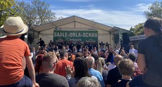 Die Saale-Orla-Schau hat auch in ihrer 32. Auflage nichts von ihrer Anziehungskraft verloren. Die größte Regionalmesse Ostthüringens lockte einmal mehr tausende Menschen an den Pößnecker Viehmarkt und trotzte dabei auch einem denkbar ungünstigen Auftakt. Regen wie aus Eimern erforderte es, dass die vom Chor der Pößnecker Grundschule musikalisch begleitete Eröffnung erstmals seit mehr als einem Jahrzehnt von der Freiluftbühne in die schützende Shedhalle verlegt werden musste.