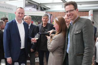 Köstliches von und mit den Partnerlandkreisen zur Saale-Orla-Schau: Katharina Klein, Weinprinzessin aus dem Rheingau-Taunus, schenkt Landrat Christian Herrgott sowie Peter von der Grün, Landrat aus Neuburg-Schrobenhausen, ein Glas Wein ein.