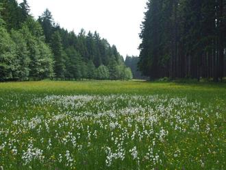 Artenreiches Nassgrünland im Flächennaturdenkmal „Leukera“, hier mit Blühaspekt des Schmalblättrigen Wollgrases.