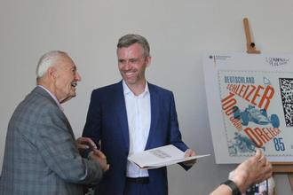 Carsten Reymann vom Bundesfinanzministerium gratuliert Siegfried Aurich von den Schleizer Briefmarkenfreunden, dem Ideengeber zur Sonderbriefmarke 100 Jahre Schleizer Dreieck.