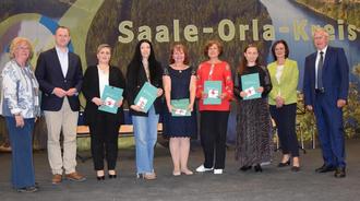 „Menschen wie Sie sind die guten Beispiele, die zeigen, dass man auch einfach unbürokratisch helfen kann. Als staatliche Stellen können wir Rahmenbedingungen schaffen, aber ohne ehrenamtliche Helfer wie Sie kann Integration nicht gelingen“, so Landrat Thomas Fügmann. Die Beigeordneten des Landrates Christian Herrgott, Almut Lukas und Katrin Gersdorf übergaben die Zertifikate.