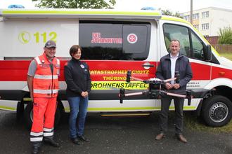 Der Zugführer des Katastrophenschutzes der Johanniter im Saale-Orla-Kreis, Marco Rosenmüller, Skadi Köhler, Johanniter Landesvorstand für Sachsen-Anhalt und Thüringen, und Landrat Christian Herrgott bei der offiziellen Indienststellung der neuen Drohne.