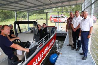 Insgesamt hat der Saale-Orla-Kreis in die Anschaffung des Rettungsbootes und der Garage fast 200.000 Euro investiert. Der Bedarf dafür habe sich insbesondere beim fünftägigen Großbrand im Waldgebiet am Heinrichstein im Frühjahr 2019 manifestiert, erinnerte der zuständige Fachbereichsleiter des Landratsamtes, Marcel Rauner. Inzwischen gab es für das Rettungs- und Mehrzweckboot, einen Katamaran vom Typ „Faster Cat 73“, bereits mehrere Einsätze sowohl zur Personenrettung als auch zur Brandbekämpfung im Uferbereich.