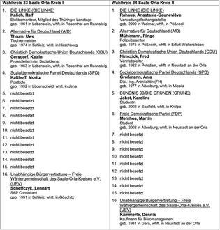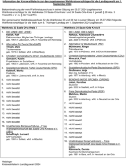Bekanntmachung der vom Wahlkreisausschuss in seiner Sitzung am 05.07.2024 zugelassenen Wahlkreisvorschläge für die Wahlkreise 33 Saale-Orla-Kreis I und 34 Saale-Orla-Kreis II gemäß § 28 Abs. 3 ThürLWG i. V. m. § 36 ThürLWO.