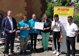 Netzwerk-Sprecherin Claudia Luckhardt (Mitte) übergibt die Auszeichnung zum „Kulturförderverein des Monats Juni 2025“ an den Vereinsvorsitzenden Stefan Blecks. Von links: Landrat Christian Herrgott, Musikschulleiter Daniel Vlad, Lotto-Öffentlichkeitsmitarbeiterin Corinna Haller und der Erste Beigeordnete der Stadt Pößneck Heiko Lehrmann gehörten zu den ersten Gratulanten.