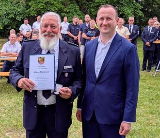 Eine weitere Ehrenmedaille des Saale-Orla-Kreises wurde außerhalb des Jahresempfanges vergeben. Als erster Polizeibeamter in der Geschichte des Saale-Orla-Kreises erhielt Klaus Mergner die höchste Auszeichnung des Landkreises. Mergner stand für die bemerkenswerte Zeitspanne von 44 Jahren im Dienst der Öffentlichkeit. „Als Garant für Sicherheit und Ordnung hat er seit über zwanzig Jahren die Polizeiarbeit in unserem Landkreis geprägt und maßgeblich dazu beigetragen, den Saale-Orla-Kreis sicherer und lebenswerter zu machen“, begründete Landrat Christian Herrgott die Auszeichnung. Diese sei sowohl eine Anerkennung für die Verdienste Klaus Mergners als auch ein großes Zeichen der Wertschätzung für alle Polizeibeamtinnen und Beamten, die tagtäglich ihr Bestes für die Sicherheit der Ihnen anvertrauten Menschen geben, betonte der Landrat in seiner Rede.