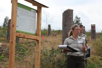 Bei Ziegenrück wurde Anfang August Thüringens erster Waldzukunftspfad eröffnet und damit ein „Herzensprojekt der Forstämter und der gesamten Region“, wie es die Leiterin des Forstamtes Schleiz, Katharina Pietzko (Foto) formulierte. Der rund 1,5 Kilometer lange Rundweg besteht aus 25 Stationen, die sich mit verschiedenen Aspekten des Themas Waldumbau und Wiederaufforstung beschäftigten. Die Stationen sind mit Infotafeln versehen, die ausdrücklich nicht nur Fachleute ansprechen und befassen sich beispielsweise mit verschiedenen Varianten der Einzäunung, für die Wiederaufforsten geeigneten Baumarten, der richtigen Saat oder sogenannten „Hochstubben“.