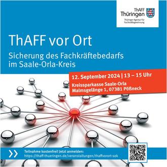 Wie können Unternehmen aus dem Saale-Orla-Kreis neue Fachkräfte gewinnen und ihre Beschäftigten auch unter unsicheren Vorzeichen binden und motivieren? Während in manchen Branchen Stellen reduziert werden müssen, steigt in anderen Wirtschaftszweigen der Personalbedarf. Orientierung und neue Impulse erhalten Unternehmen aus der Region am Donnerstag, 12. September 2024, 13 bis 15 Uhr im Rahmen der Veranstaltung „ThAFF vor Ort im Saale-Orla-Kreis - Sicherung des Fachkräftebedarfs“. Durchgeführt wird die Veranstaltung von der ThAFF und der Wirtschaftsförderung des Landratsamtes in den Räumlichkeiten der Kreissparkasse Saale-Orla, Geschäftsstelle Pößneck / Ost, Malmsgelänge 1, 07381 Pößneck.