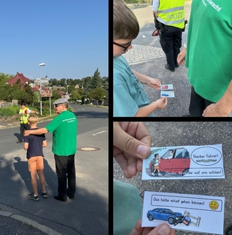 Mit einer mobilen Geschwindigkeitsmesstafel kontrollierten die Beteiligten die Geschwindigkeit der vorbeifahrenden Fahrzeuge. Anstelle eines Bußgeldes erhielten die Autofahrer direktes Feedback - und zwar von den Kindern selbst. Zusammen mit Lutz Blumenstein von der Verkehrswacht verteilten sie kleine Zettel mit dem Ergebnis ihrer Kontrolle an die Autofahrer. Wer zu schnell fuhr, wurde ermahnt, wer sich korrekt verhielt, bekam ein Lob. Der direkte Kontakt zwischen Kindern und Erwachsenen hatte dabei eine besonders starke Wirkung.