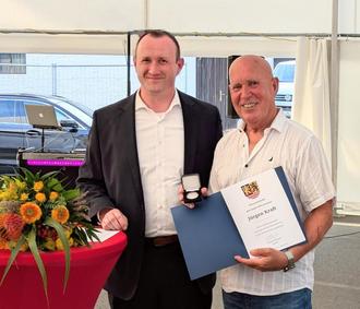 Für sein beispielhaftes berufliches und ehrenamtliches Engagement erhielt er die Ehrenmedaille des Saale-Orla-Kreises. Die Auszeichnung wurde ihm von Landrat Christian Herrgott überreicht, der vor den anwesenden Mitarbeiterinnen und Mitarbeitern sowie zahlreichen weiteren Gästen die Laudatio zu diesem besonderen Anlass verlas. Über die Auswahl der Empfänger dieser höchsten Auszeichnung des Landkreises entscheidet alljährlich der Kreistag.