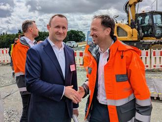 „Die Arbeiten für den SuedOstLink schreiten gut voran. Das macht uns stolz und ist nur möglich, weil hier Auftraggeber und Baufirmen mit Engagement auf ein gemeinsames Ziel hinarbeiten. Das Richtfest ist nur ein kleiner Schritt, aber er steht für die gute Zusammenarbeit von mehr als 40 Partnerunternehmen und mehreren hundert Mitarbeitenden allein im Vorhabenteil von 50Hertz. Diese gute Zusammenarbeit möchten wir heute feiern“, begrüßte Lorenz Müller, Bereichsleiter der Gleichstromprojekte von 50Hertz, die rund 40 Gäste des Richtfests.